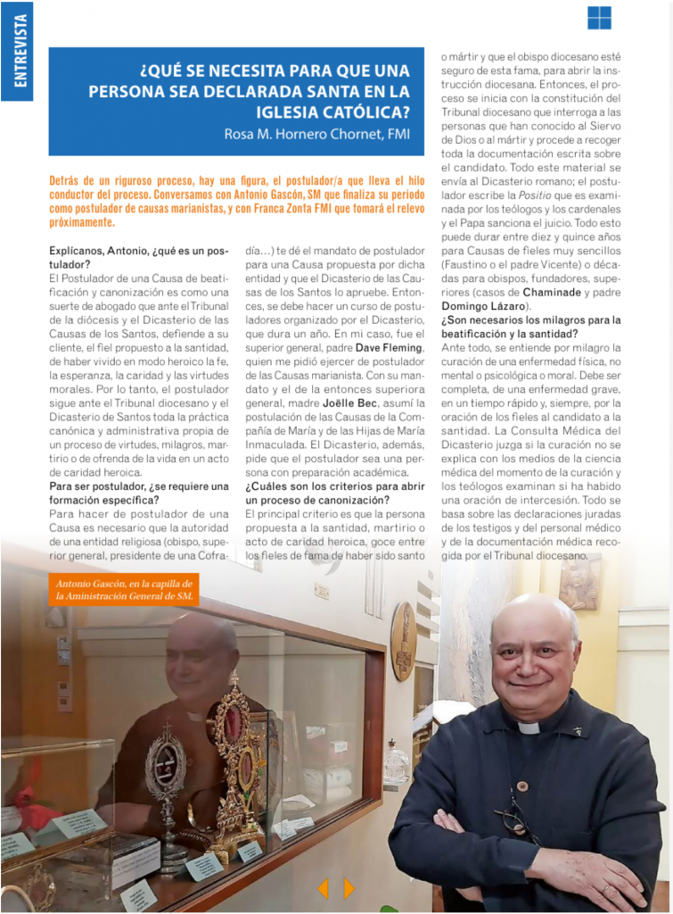 Pero, ¿cómo se llega a ser santo? Sobre ello, hablamos con Antonio Gascón SM, postulador de las Causas marianistas, y con Franca Zonta FMI, quién le releva en su cargo el próximo septiembre. Nos cuenta cómo se nombran a los santos en la Iglesia y cómo viven este encargo de la Familia Marianista. Además, en este número, contamos con el testimonio de una comunidad transoceánica, promovida por Martín Valmaseda y que conecta Guatemala con España; desde Acción Marianista nos explican tres proyectos de impacto que llevan a cabo en India, Burkina Faso y en la Patagonia argentina; y los jóvenes nos traen la celebración de la Candelaria, donde rezaron por las vocaciones religiosas. En lo educativo, el Bachillerato Intercongregacional Santa María de Logroño comparte su alegría de haber cumplido 25 años y la red de colegios celebra su encuentro anual de equipos directivos (Redencuentro), bajo el lema: ‘Somos relación’. Por último, las fraternidades nos hacen partícipes del relato carismático en el que llevan trabajando estos últimos años y los religiosos publican un nuevo capítulo de sus Testimonios de Vida, con Chema Gil como protagonista. ¡Cuántos santos de la puerta de al lado hay en este número!